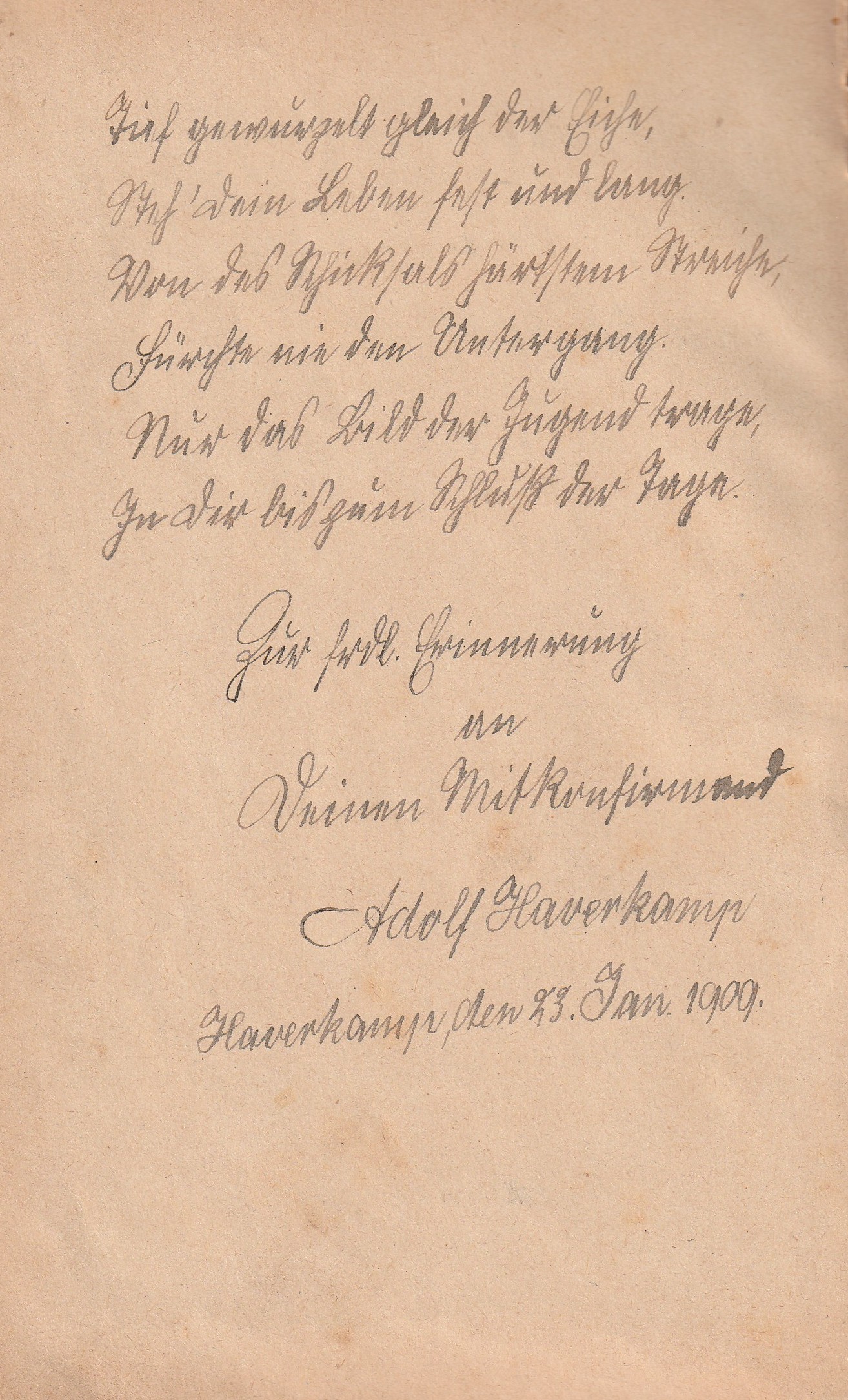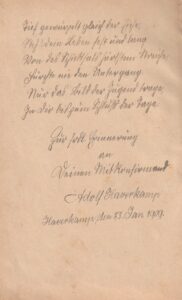 Zwischen Januar und März 1909 hat Hermanns Mitschülerin Luise Claußen im Vorfeld ihrer Konfirmation ein Poesiealbum herumgereicht. Neben einem Vertreter des damaligen Huder Pastors Robert Tiarks und dem Linteler Dorfschullehrer Karl Belke haben sich insgesamt 49 Mitkonfirmanden und Mitschüler eingetragen, darunter auch Adolf. Sein Eintrag datiert vom 23. Januar 1909: