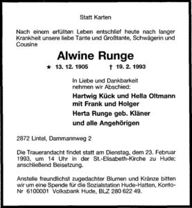 Alwine Runge – Traueranzeige