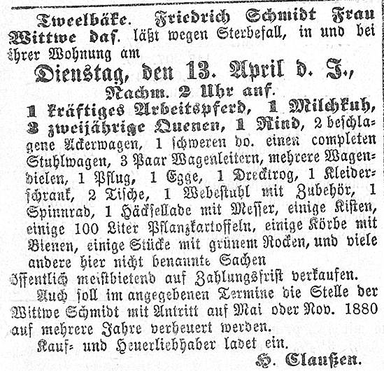 Im März 1880 stirbt dann auch Vater Friedrich, und zwar an einem „Brustleiden“. Möglicherweise ein Hinweis auf die im 19. Jahrhundert allgegenwärtige Volkskrankheit Tuberkulose. Dass Mutter Gesine Catharine sich in dieser Situation nicht anders zu helfen weiß als kurzerhand einen großen Teil des Hof-Inventars (unter anderem ein Pferd, fünf Rinder und mehrere Ackerwagen) öffentlich versteigern zu lassen und ihre Ländereien zu verpachten, ist verständlich – zumal sie sich bereits wieder in anderen Umständen befindet: Gesines jüngster Bruder Johann Diedrich kommt im Oktober 1880 zur Welt.