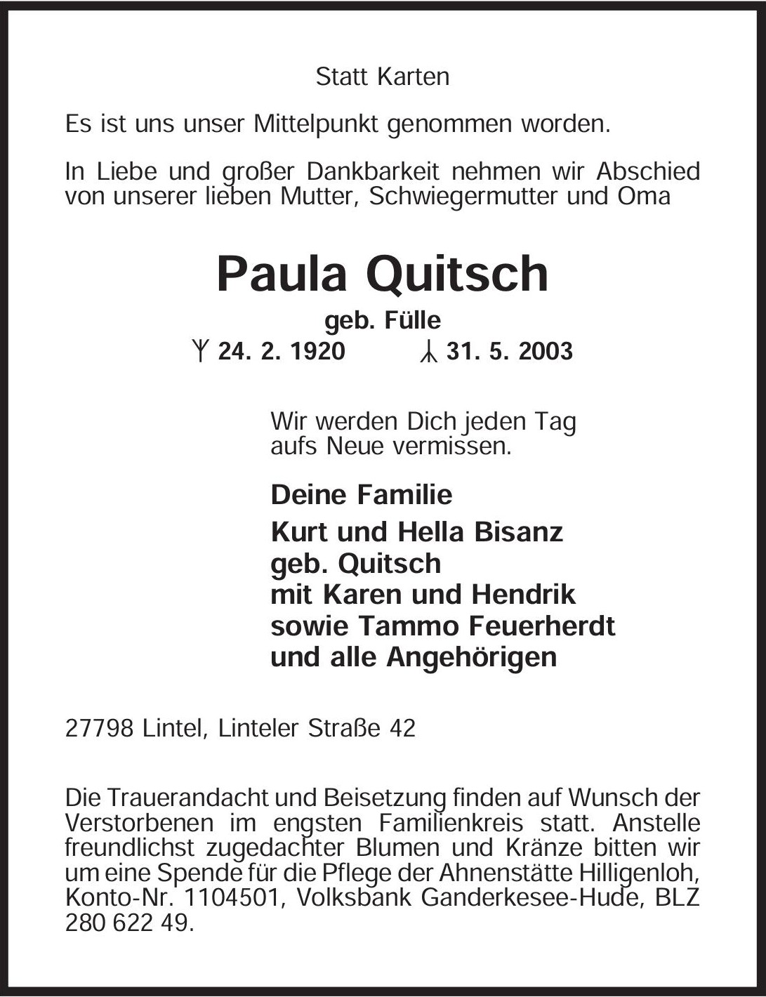 Paula Quitsch – Traueranzeige